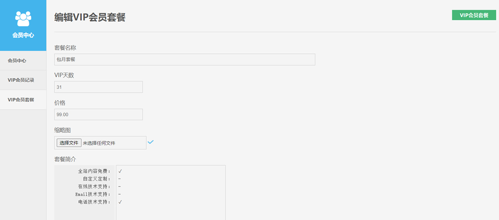 要使用VIP模塊,首先要通過DouPHP后臺的“DouPHP+”安裝“VIP會員模塊”,安裝后即可設置會員套餐,可以添加會員套餐,里面可以設置會員價格,還有天數(這里統一以天為單位),套餐簡介部分的會員權限選項在VIP會員套餐列表頁右上角的“設置”中進行設置,設置好后,在套餐簡介中逐行輸入打勾或者打叉符合標注當前套餐的會員權限。