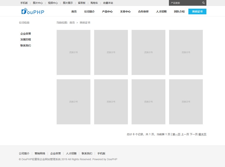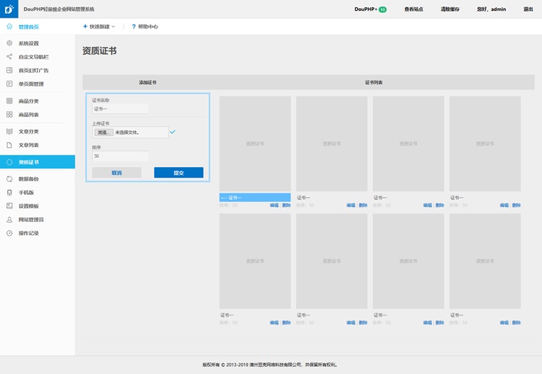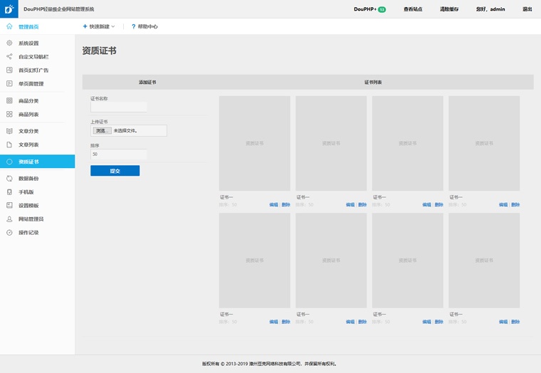 - 登錄網站后臺點擊“DouPHP+”在線安裝“資質證書模塊”