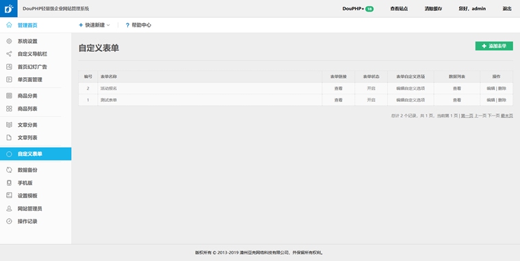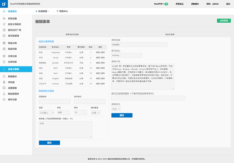 自定義表單模塊,可以由用戶可以根據需求,自由組合表單元素生成表單,“自定義表單”模塊需要在網站后臺頂部的“DouPHP+”找到“自定義表單”模塊進行安裝。