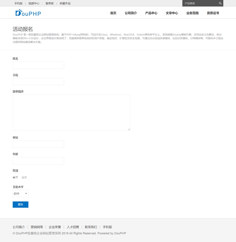 方式二:查看方式一表單頁面的源代碼,然后復制form部分的代碼,到您需要放置表單的頁面模板文件,這樣可以實現比較個性化定義,比如可以放到首頁,放到網站底部,可以放在指定的內頁,可以對樣式進行設計,總之“自定義表單”可以放在任意位置,當然您需要有一點技術基礎。