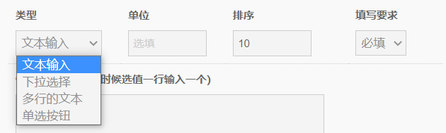 4,單位:是指顯示在表單元素輸入框后面的文字,比如創建的表單元素是“面積”,這里需要告訴用戶單位是平方米,則這里單位就輸入平方米。