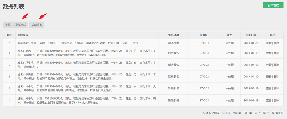 通過“自定義表單”收集到用戶提交的數據都會顯示在后臺“自定義表單”-》“數據列表”,在列表里可以根據具體哪個表單進行分組顯示