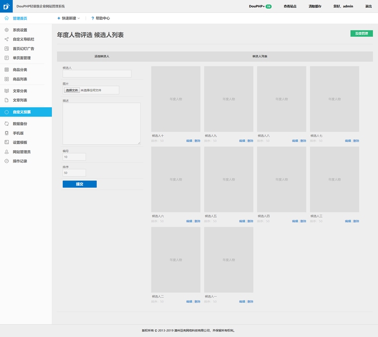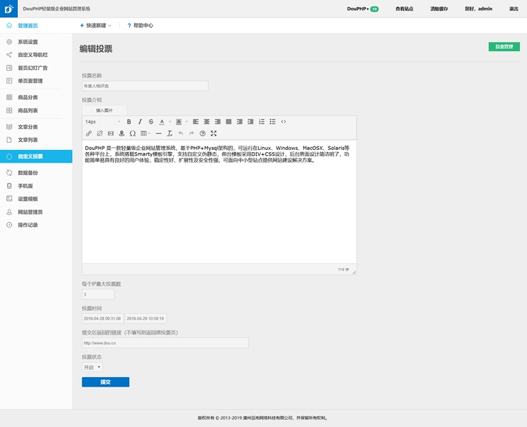 - 登錄網站后臺點擊“DouPHP+”在線安裝“自定義投票模塊”